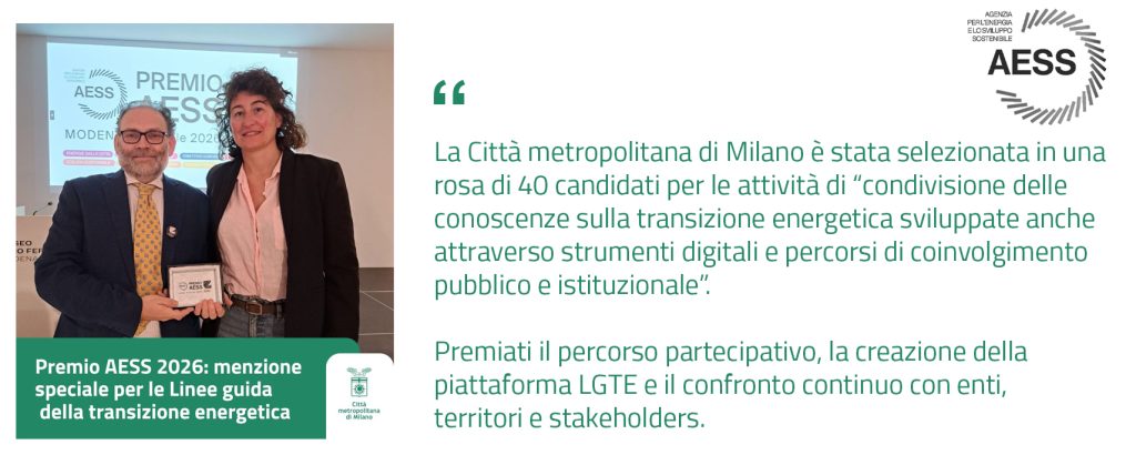 Le Linee guida per la transizione energetica della Città metropolitana di Milano hanno ottenuto una menzione speciale nell’ambito del premio AESS 2026, durante la XXII edizione della Settimana della Bioarchitettura e della Sostenibilità, dedicata quest’anno al tema “Abitare il clima. Strategie e azioni per vivere le città di domani”.